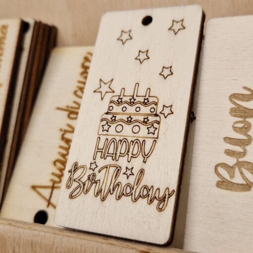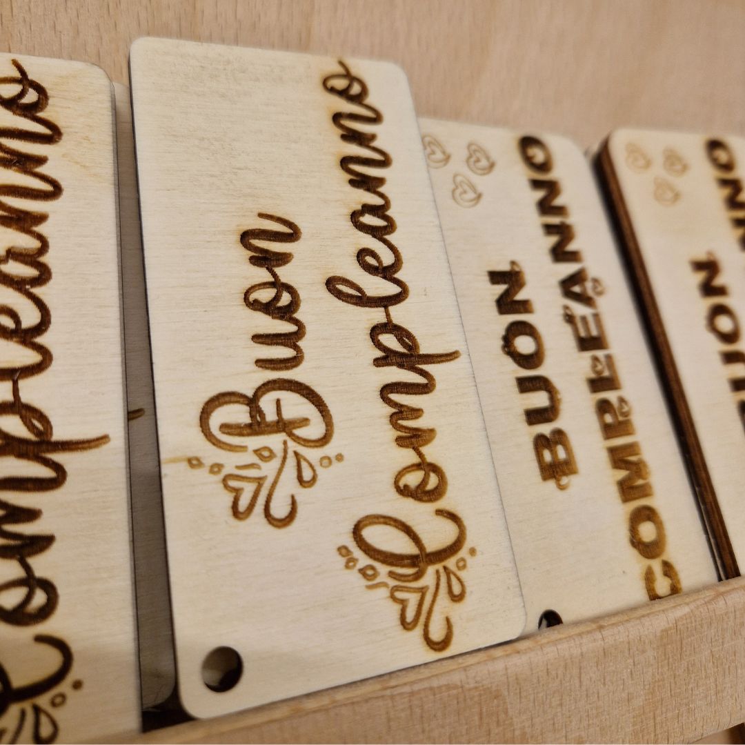 Targhetta in legno con incisione laser “Buon Compleanno”: ideale per completare un’idea regalo o un bel mazzo di fiori freschi! Disponibili vari formati: specificare eventuali preferenze nel campo “richieste particolari”.
